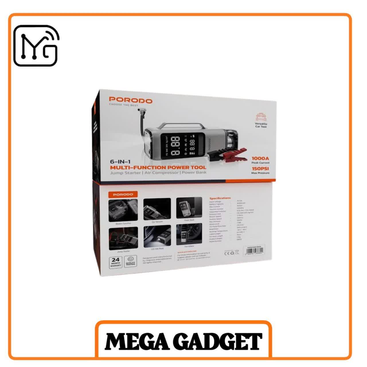 جامپ استارتر و پمپ باد 6 کاره پرودو Porodo 6-in-1 Multi Function Power Tool PDPBFCH091BKGR یک ابزار حرفهای و همهکاره برای خودرو و سفر است که با طراحی هوشمند خود میتواند در شرایط اضطراری بهترین همراه شما باشد. این دستگاه ترکیبی از جامپ استارتر قدرتمند، پمپ باد، پاوربانک، چراغ قوه، اینورتر و ابزار ایمنی را در یک مجموعه جمعوجور ارائه میدهد.