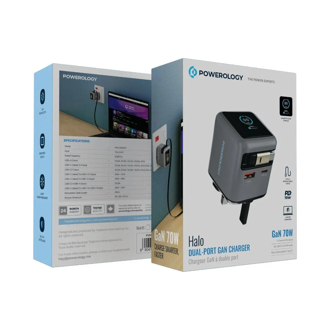 آداپتور شارژ هوشمند پاورولوژی Halo Dual-Port GaN PWCUQC051 یک شارژر پیشرفته و حرفهای است که با بهرهگیری از فناوری GaN (گالیوم نیترید) عملکرد سریعتر، بازده بالاتر و حرارت کمتر نسبت به شارژرهای سنتی ارائه میدهد. این مدل با توان ۷۰ وات و داشتن دو پورت خروجی، امکان شارژ همزمان دو دستگاه دیجیتال را فراهم میکند.