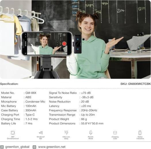 میکروفون یقهای وایرلس گرین لاین GM-88X - کیفیت استودیویی با نویزکنسل هوشمند